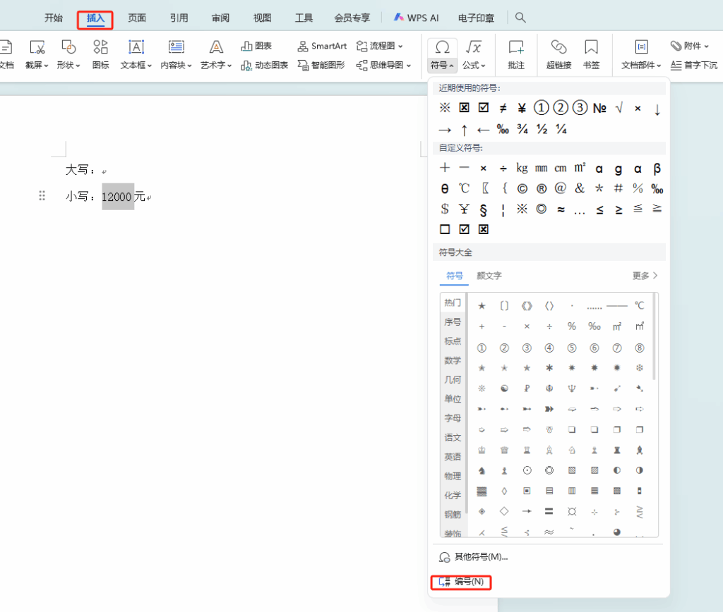 1、在Word文档中输入小写数字并选中。2、点击菜单栏的“插入”选项卡,选择“符号”组中的“编号”。