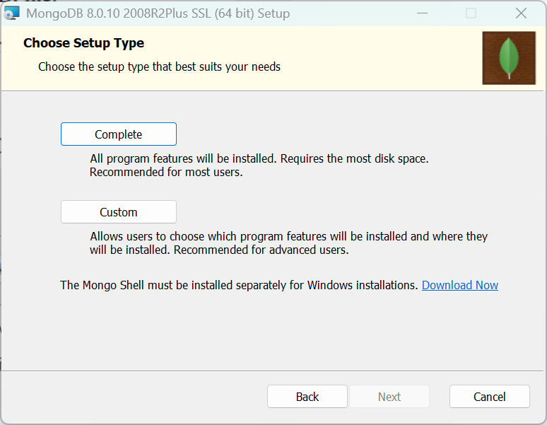 下面这里如果是普通用户,追求简单快捷安装,选 Complete(完整安装) ,会装所有功能,省事儿,就是占磁盘空间多些;要是进阶用户,想自定义安装组件、选安装路径,就选 Custom(自定义安装) ,能按需配置 。按需求选好点 “Next” 继续安装流程就行,另外注意 Mongo Shell 得单独装,有 “Download Now” 可点 。