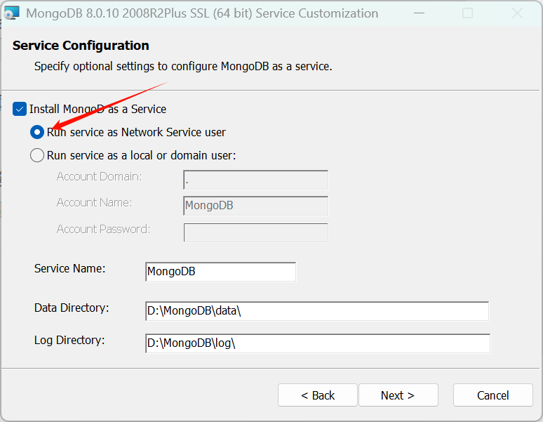 现在,出现了两个选择:您可以以网络服务用户身份运行 MongoDB,也可以以本地或域用户身份运行它。