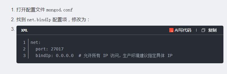 默认情况下,MongoDB 只允许本地访问。如果需要从远程连接,需要修改配置文件: