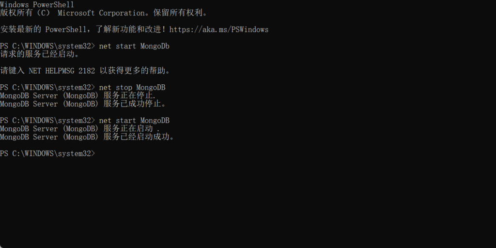 输入 net start MongoDB (“MongoDB” 是服务名,若安装时自定义过,需填实际名称 )。
