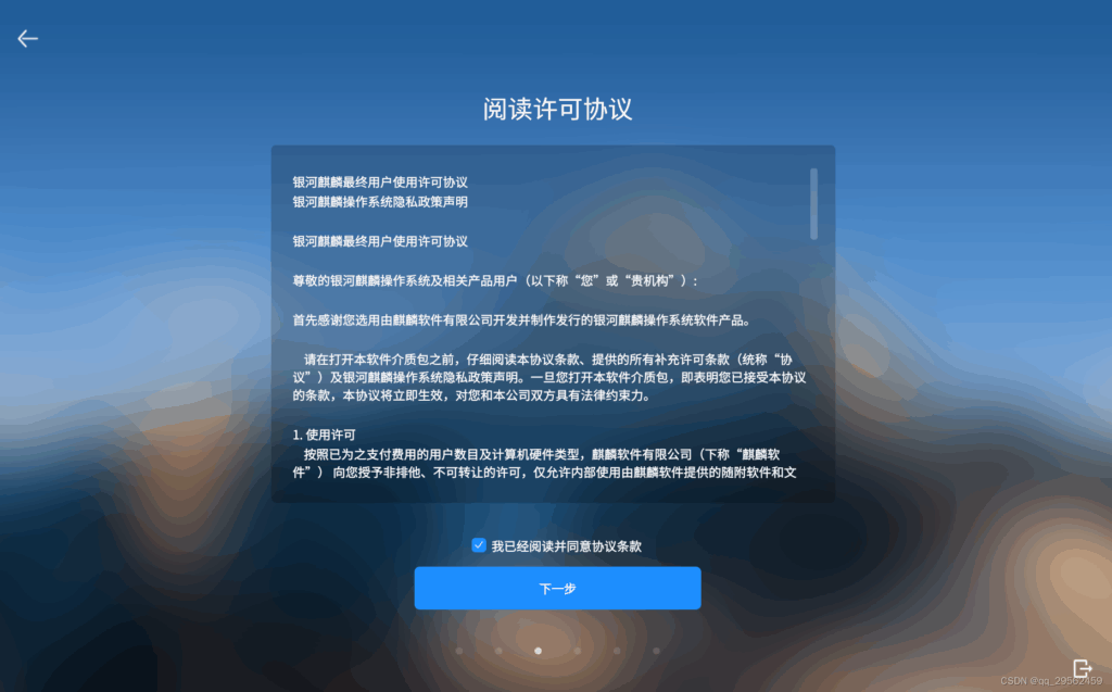 双击图标“安装 Kylin”,开始安装引导,根据提示选择,点击下一步继续后续操作,如图3、4所示。