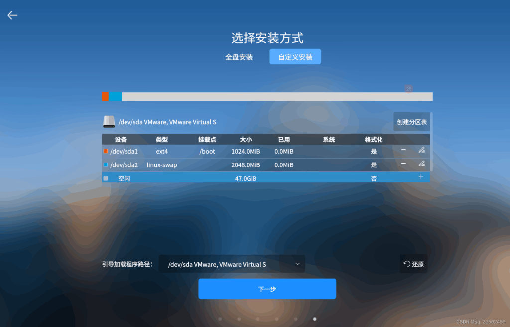 首先创建boot分区,/boot 必须是主分区中的第一个分区,用于选 择“etx4”,挂载点选择“/boot”,boot分区大小推荐 1GiB到 2GiB 之间,不可小于500MiB。