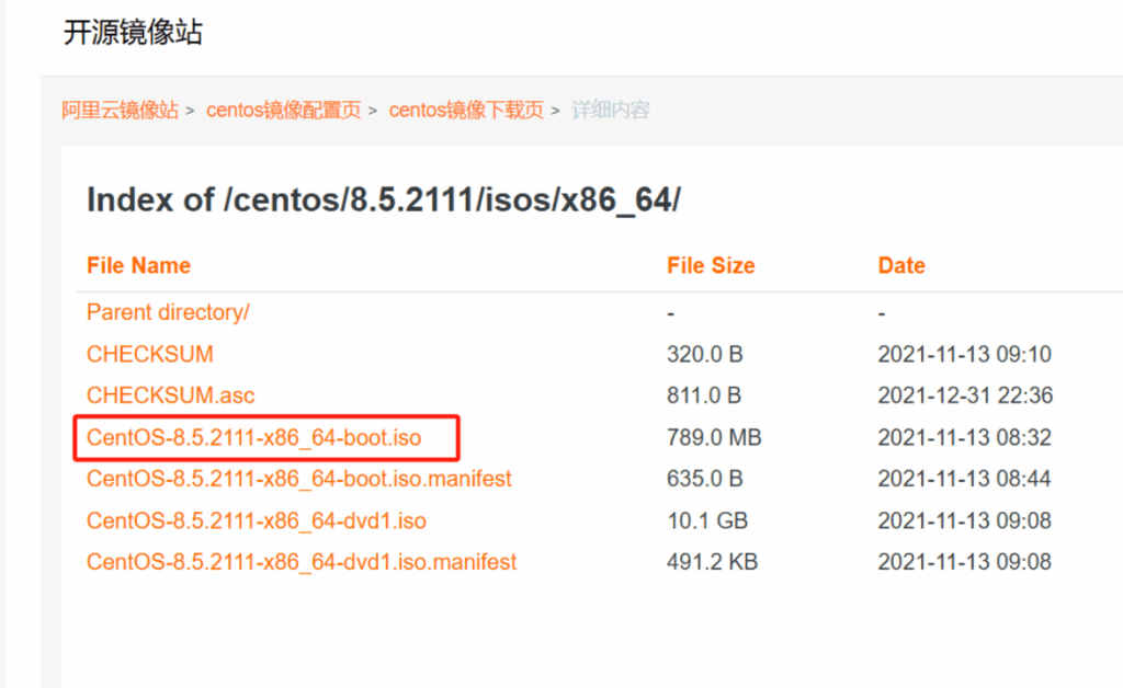 1.首先,需要在阿里开源镜像站下载对应的镜像,如下:https://mirrors.aliyun.com/centos/8.5.2111/isos/x86_64/CentOS-8.5.2111-x86_64-boot.iso