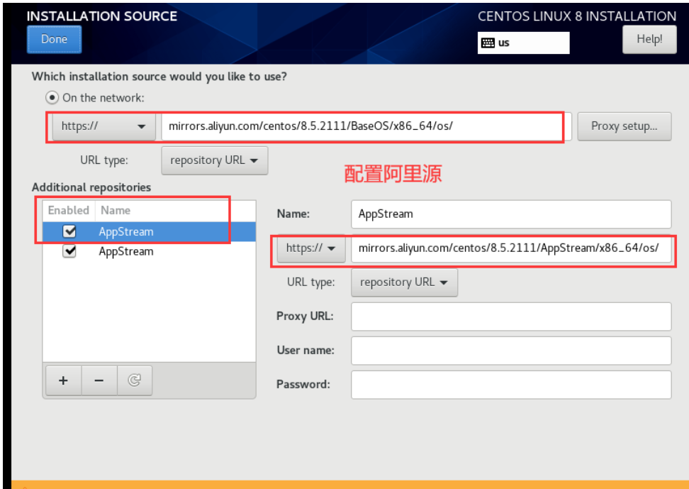 5.我们首先配置安装最小源,在下方依次填入,https://mirrors.aliyun.com/centos/8.5.2111/BaseOS/x86_64/os/